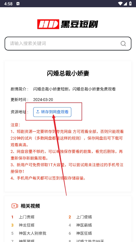 然后挑选需要的短剧进入详情页面,点击“转存到网盘观看”按钮。