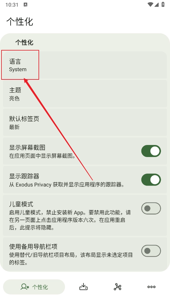 进入后在个性化页面点击"语言",如图所示。
