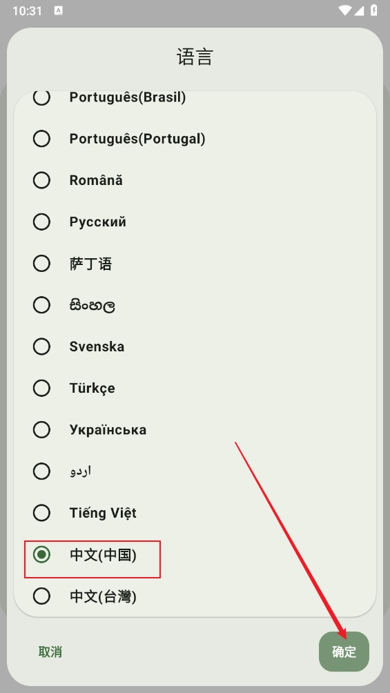 最后在语言设置界面滑动至最底部,找到并选择“中文”选项,然后点击“确定”按钮就可以了。