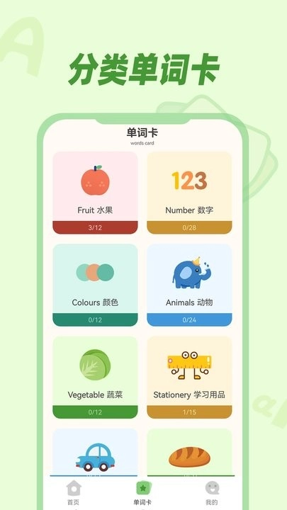 各种主题单词卡,水果、蔬菜、动物、数字等多种分类,每张单词卡都配有对应的练习