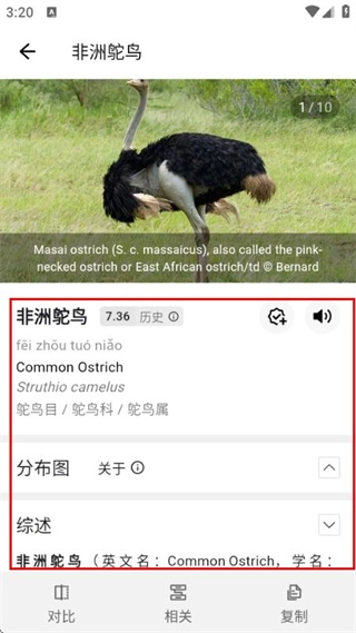 可以在详情页面查看这只鸟的名称、所属分类以及综述等信息,从而了解它的相关内容。