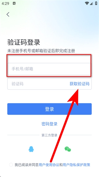 在登录页面,输入手机号邮箱,点击获取验证码。