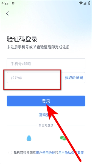 在输入框里填入验证码,勾选相关协议,接着点击登录按钮,即可完成账号的登录操作。