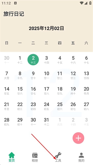 在旅行日记的首页,点击底部导航栏里的“工具”选项,就能进入户外小工具页面啦。