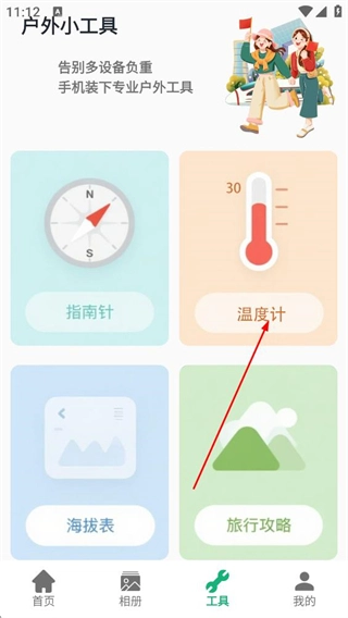在户外小工具页面,点击温度计选项,即可进入温度计功能页面。