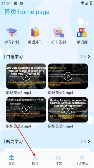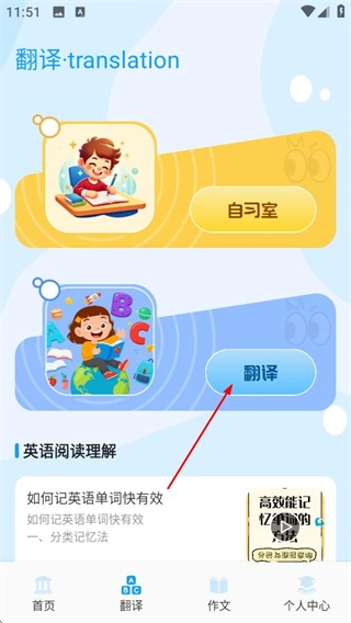 进入萌趣英语宝后,点击底部导航栏的翻译选项,即可进入翻译功能页面。