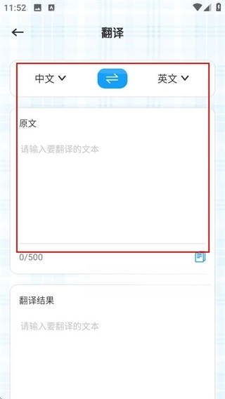 3、在翻译操作界面中,能够选择语言方向,并且在原文输入框内填写需要翻译的内容。