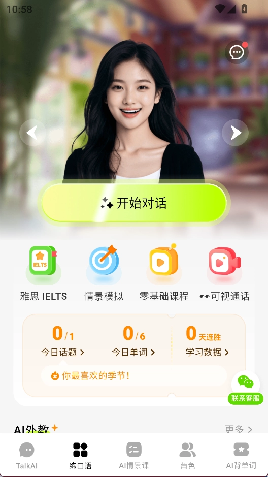 3、进入练口语界面就能开始对话、背单词了