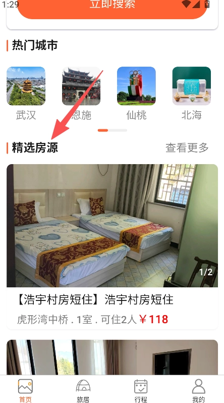 1、设热门城市选择板块,含精选房源展示,通过多维度条件筛选房源,适配不同的旅居住宿查找需求。