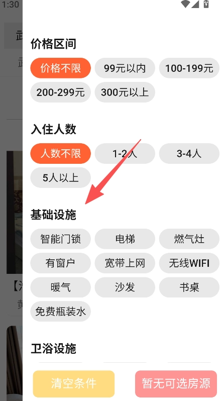 2、在筛选界面选择价格区间入住人数等条件。