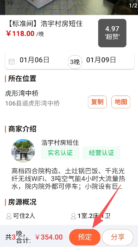 3、展示房源详情并设预定功能,查看住宿信息后完成旅居房源的预订操作。