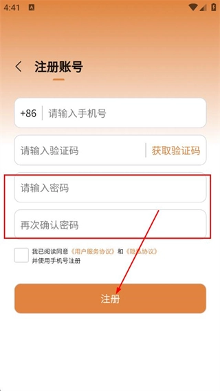 3、在注册账号页面,填写密码和确认密码,点击注册按钮,完成注册操作。