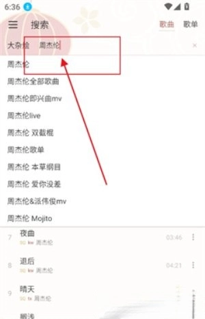 1、点击搜索,在搜索框输入歌手名,歌曲名,精准检索歌曲。