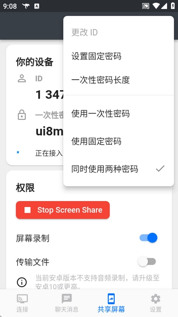 启用"屏幕共享"功能可实时共享移动设备屏幕画面。
