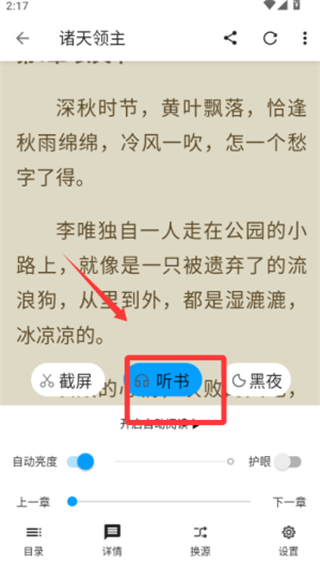 4、在菜单页面中间点击听书就可以开始听书了,不过小部分小说是没有听书功能的。