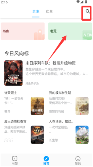 1、进入软件后,可以在推荐页面的小说分类中或者点击右上角的搜索去查找小说。