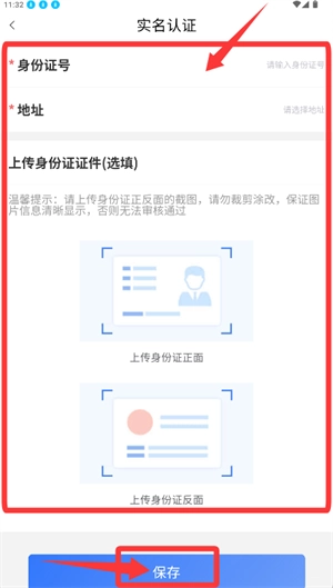 请如实填写身份证号码与地址信息,完成证件上传操作后保存即可。