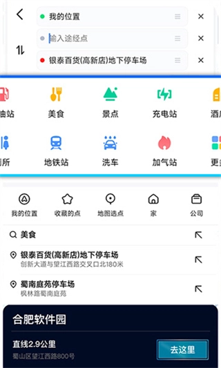 在“发现”板块中,你可以按照美食、加油站、停车场等不同类别,查看周边各类地点的详细信息,而且还能一键启动导航功能前往目的地。