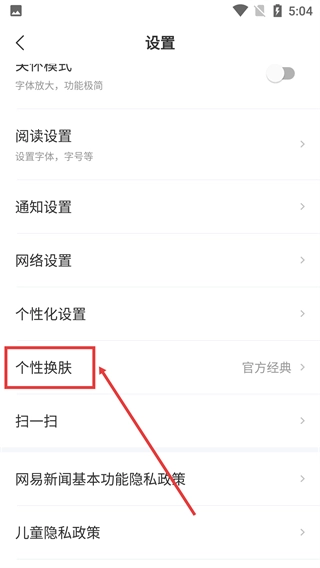 在【设置】界面中找到【个性换肤】这一选项,目前该选项显示的是【经典】,点击此选项就能进入皮肤更换的页面。