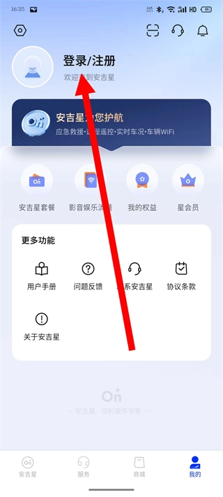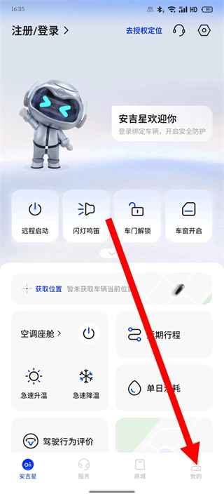 进入安吉星首页后,点击页面底部的“我的”按钮,即可切换到个人页面。