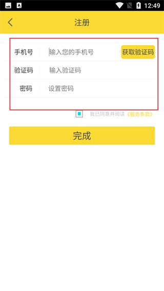 在注册页面按顺序填写【手机号】、【验证码】和【密码】,勾选同意《服务条款》后点击【完成】按钮,提交相关信息即可完成注册流程。