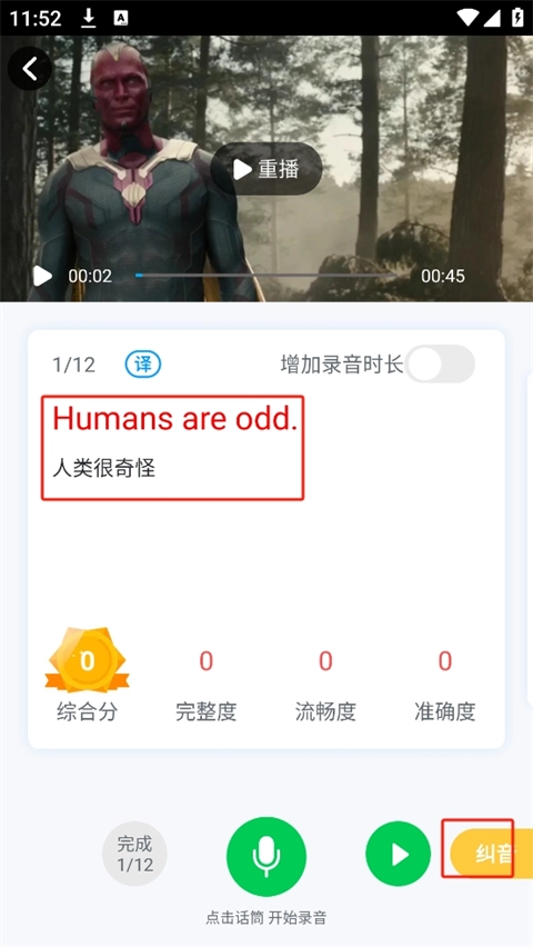 要是某句话的得分不太理想,你可以点击纠音按钮查看每个音节的评分情况,然后再重新尝试一遍。