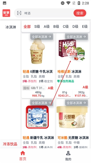 在应用首页左侧的分类栏里,点击【冷冻饮品】这个选项,就能进入到冷冻饮品的商品列表页面。