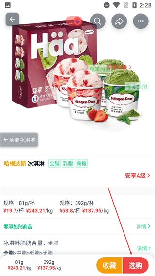在冷冻饮品的列表里挑选想要的商品(例如“哈根达斯冰淇淋”),接着点击进入该商品的详情页面。