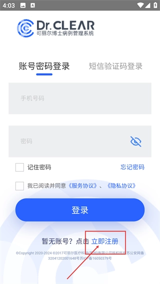 进入可丽尔博士病例管理系统的登录页面后,点击“立即注册”按钮,即可进入注册流程。
