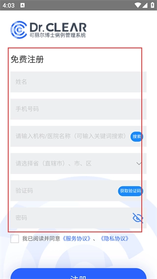 进入免费注册界面后,要按顺序填写“姓名”和“手机号码”,接着搜索并选定所属的机构或医院名称,等所有信息都填写完毕,点击注册按钮就能提交信息了。