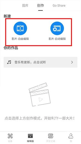 接下来选择“创作”选项,确定创作模式后,点击“立即开始创作”按钮。