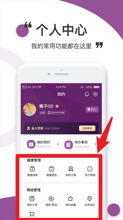 个人中心整合了健康管理、商城订单等功能模块,方便用户集中查看与操作。