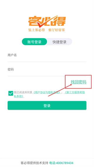 进入【客必得】的账号登录界面后,你可以填写用户名和密码来完成登录;要是不小心忘记了密码,点击【找回密码】就能进入密码找回的相关流程。