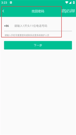 在找回密码页面,需要输入【+86-请输入以1开头的11位电话号码】,填写完毕后点击【下一步】按钮来继续密码重置流程。
