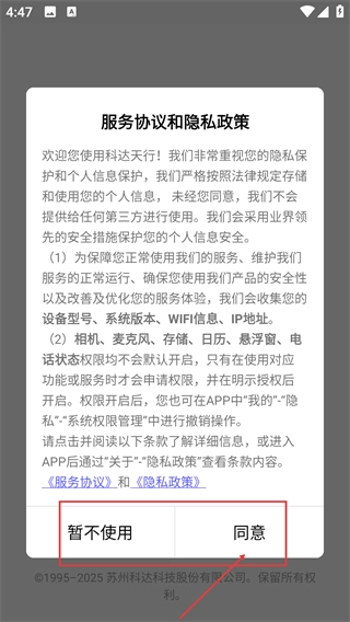 进入科达天行的服务协议与隐私政策弹窗页面后,点击【同意】按钮,即可接受相关协议并继续进入应用。