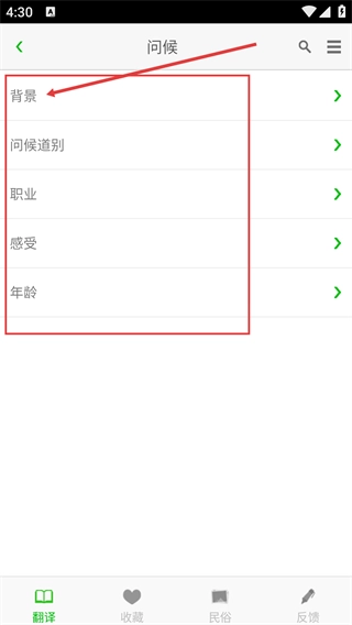 进入“问候”分类的子分类页面后,能够选择“背景”“问候道别”等细分的内容类型,以此进一步精准筛选出所需翻译的内容方向。