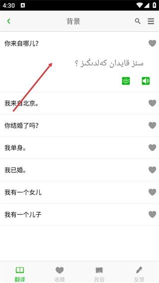 进入“背景”子分类页面后,就能看到该类别下的具体交流语句,像“你来自哪儿?”“我来自北京。”之类的都包含在内。