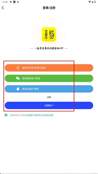 进入登录或注册页面后,你可以选择“使用手机号/来惜号登录”“使用微信账户登录”等登录方式,也可以点击“创建账户”按钮完成注册操作。