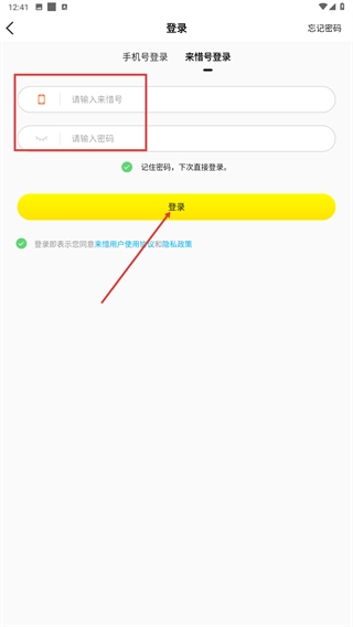 当选择用来惜号登录时,需在【请输入来惜号】和【请输入密码】的输入框中填写对应信息,确认相关协议后点击【登录】按钮,即可完成登录流程。