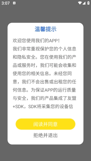 并安装后打开软件,需要先同意其隐私权限设置。