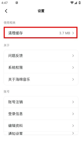 在【设置】页面中,找到显示当前大小为3.7-MB的【清理缓存】选项,点击该选项即可触发缓存清理的确认流程。