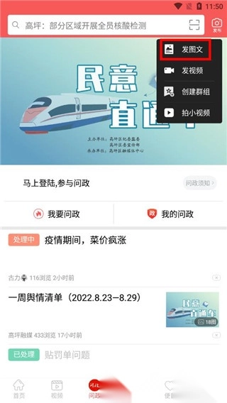 进入问政窗口后,依次点击右上角的【发布】按钮,接着再点击【发图文】选项。