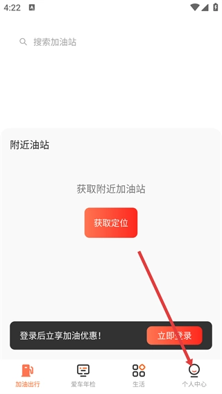 在软件主界面,点击【获取定位】按钮就能查询附近的加油站;点击底部的【个人中心】按钮,则可进入对应的功能页面。