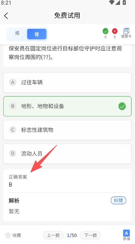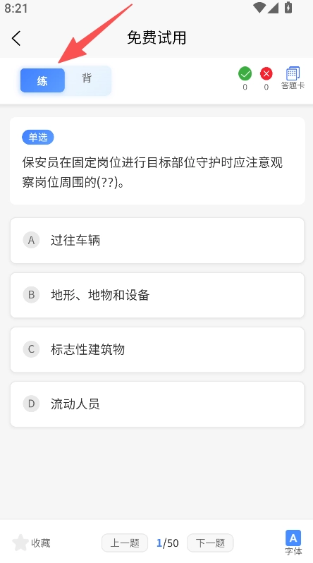 练习支持背记模式切换,可适配不同学习习惯,助力保安员掌握考证知识点。