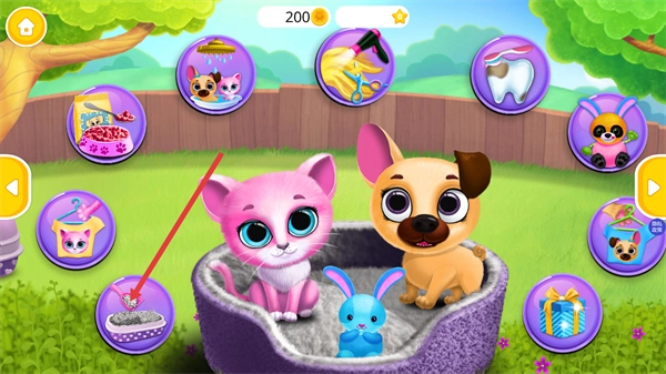 在游戏主界面,点击带有猫砂盆图标的功能按钮,就能进入对应的宠物清洁照料环节,从而推进宠物护理流程。