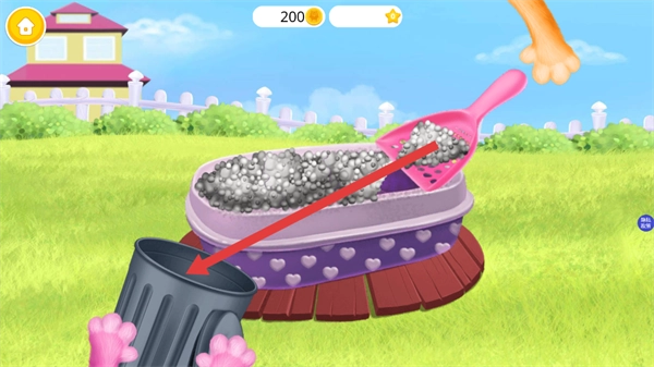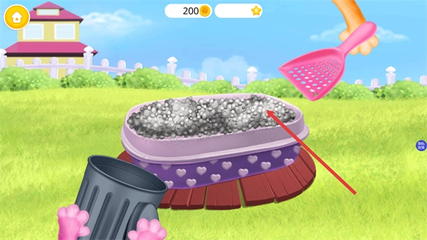 进入猫砂盆的照料场景后,拿起粉色的铲子工具,对猫砂盆里的猫砂开展清理工作,从而完成这一步护理流程。