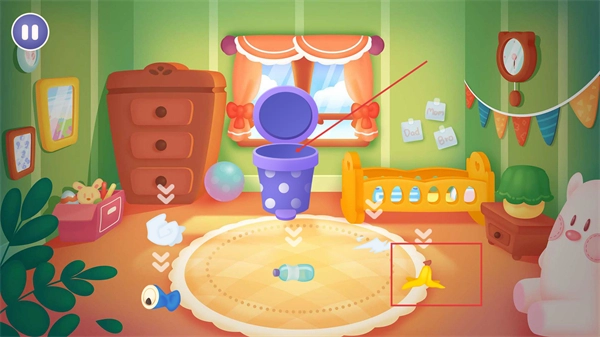 清理后,把地垫上的【香蕉皮】之类的垃圾,按照对应步骤放进弹出的垃圾桶里,这样就完成垃圾收纳了。