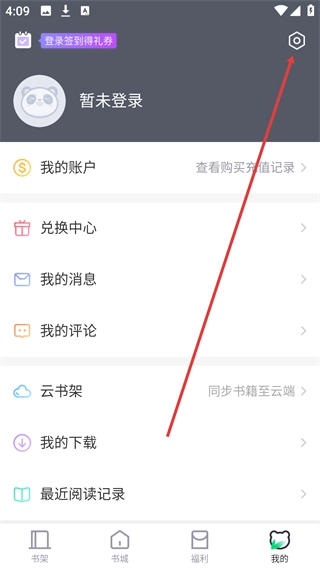 在【书架】页面,点击底部导航栏的【我的】按钮,即可进入个人中心界面。