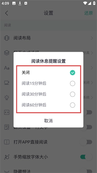 在【设置】页面里,找到【阅读休息提醒】这一选项,点击后会弹出对应的设置窗口。