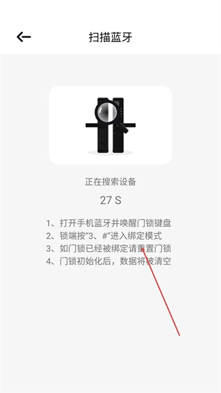 进入蓝牙扫描页面后,根据页面指引开启手机蓝牙功能,并将门锁切换到绑定模式,待设备搜索流程结束,就能完成蓝牙锁的绑定操作。